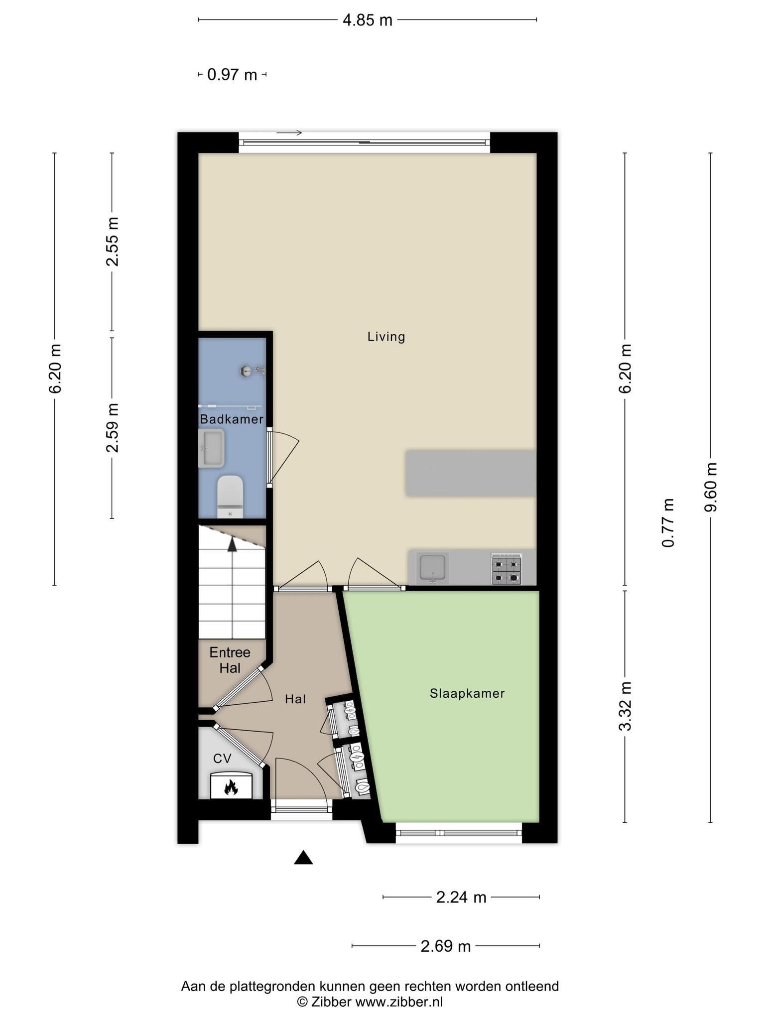 - 56 m² (11.1 meter diep en 5 meter breed)